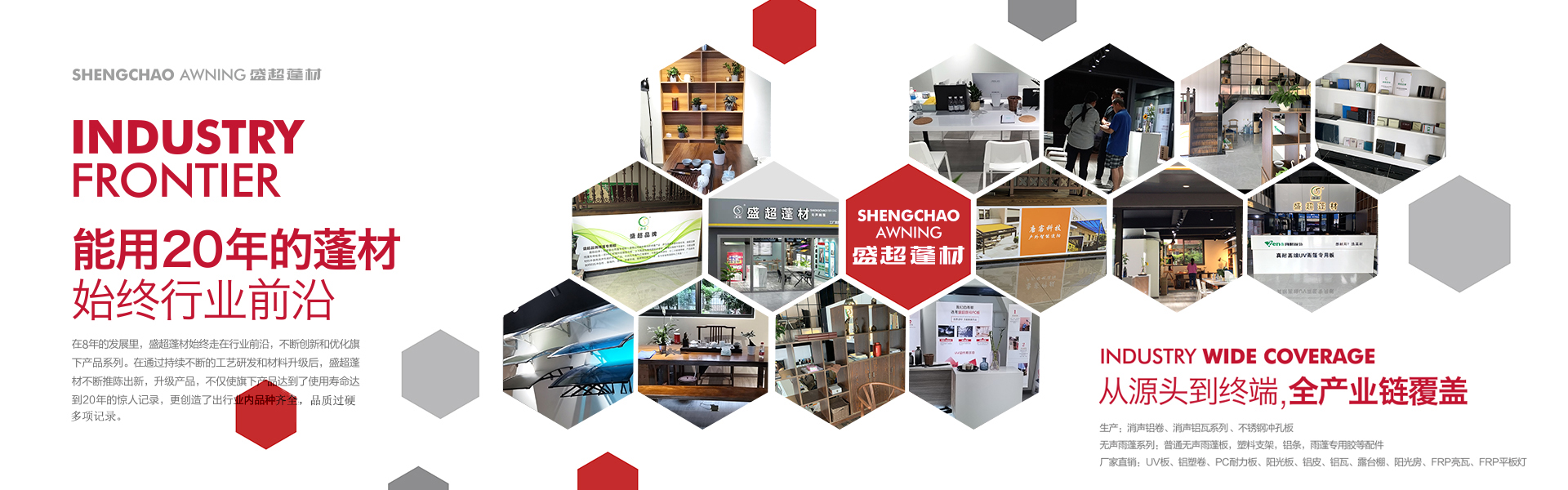 盛超蓬材是由四川超諾商貿(mào)有限公司創(chuàng)辦,是一家集研發(fā)、生產(chǎn)、銷售和服務(wù)于一體的專業(yè)雨蓬供應(yīng)商。主要產(chǎn)品:實(shí)心耐力板,中空陽光板、多層板、蜂窩板、鋁瓦、消聲鋁瓦、不銹鋼消聲等材料的雨蓬產(chǎn)品。自主研發(fā)多款雨蓬,擁有自己的專利和檢測報(bào)告。其中明星產(chǎn)品新型組裝式雨蓬,擁有組裝簡便,美觀耐用、抗噪音,性價(jià)比高等優(yōu)勢,多項(xiàng)檢測指標(biāo)領(lǐng)跑同行業(yè)。受到了市場和經(jīng)銷商的高度認(rèn)可。 公司自成立至今,從銷售到研發(fā)再到生產(chǎn),已經(jīng)過了3次跨越式的發(fā)展。2017年已成為四川雨蓬行業(yè)內(nèi)庫房面積大,員工多的一家公司。產(chǎn)值每年以平均20%的速度快速增長。可以說客戶是我們的老師,和他們合作使我們得到很多的學(xué)習(xí)機(jī)會(huì)來提高自身的技術(shù)水平和管理水平,是我們生產(chǎn)和發(fā)展的動(dòng)力。